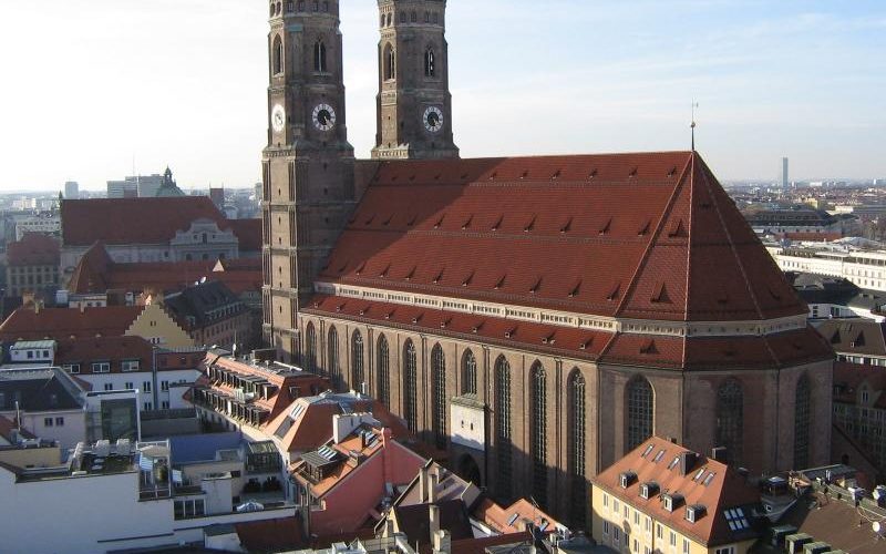 След дьяволаДля любопытствующих — вот фотография «чертова следа». Однако, кроме этого в соборе есть на что посмотреть.Прежде всего — на его внешний вид. Это характерная для Германии кирпичная готика (скажем, можно полюбоваться в Ландсхуте на знаменитый собор Святого Мартина с самой высокой в мире кирпичной колокольней). Но тут она выглядит особенно грандиозно. Две гигантские колокольни увенчаны куполами, больше напоминающими не о западноевропейском средневековье, а о Византии. «Вельшские чепцы», как называют купола колоколен, считаются предвестниками Ренесанса, они построены не раньше 1525 года, в эпоху заката готики. Хотя в южной части Баварии луковки и купола над кирхами не редкость. Башни имеют в высоту около 100 метров,точнее 98,57м и 98.45м. Высота башеньотличается не сильно, но обычно туристам называют цифру 1 метр.. Подобное же решение мы видели в Ингольштадте — там тоже домский собор с двумя колокольнями различной высоты. На референдуме 2004 года было решено не строить в Мюнхене дома выше колокоен Фрауенкирхе. Хотя там и так основная застройка в 3-5 этажей, даже в районах новостроек. Но предосторожность не помешает, если вспомнить, что творят российские застройщики. Нам бы тоже провести парочку референдумов по вопросам градостроительного искусства. Любопытно, что архитектора выбрали именно из-за того, что он был мастером кирпичной стройки, неподалеку от Мюнхена нет подходящих каменоломен и в целях экономии строить огромный собор решили из кирпича. Этот собор — практически предтеча Реформации, финансировался он на средства, вырученные от продажи индульгенций, что послужило одним из мотивов бунта Лютера в 1517 году.